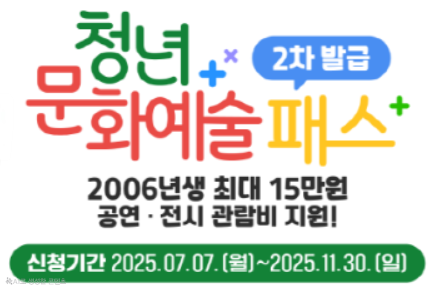 - 신청 자격: 2006년생 19세 청년 중 1차 미발급자 또는 1차 발급 후 한 번도 사용하지 않아 지원금이 회수된 경우